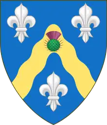 Azure, on a chevron wavy Or between three fleurs-de-lys Argent a thistle's head proper.[4][19]