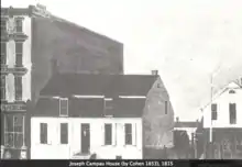 Campau lived in a log house on the south side of Jefferson Avenue, between Shelby and Griswold, that was built after the fire of 1805.[3] Frederick E. Cohen made a painting in 1853 of Campau house that was built in 1815.[3] It was also located between Shelby and Griswold on Jefferson Avenue.[13][lower-alpha 2]