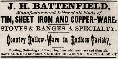 A notice was given in 1875 that the firm of Battenfield & Fowler was dissolved.[16] In 1880, Joseph is recorded working as a "tinner."[17] He opened a new "stove and tinshop" that summer.[18]