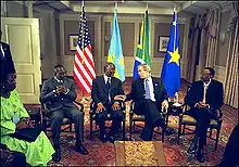 Kabila rose to the presidency on 26 January 2001 after the assassination of Laurent-Désiré Kabila, becoming the world's first head of government born in the 1970s.[12] Aged 29, he was considered young and inexperienced. He subsequently attempted to end the ongoing civil war by negotiating peace agreements with rebel groups backed by Rwanda and Uganda, the same regional armies who had brought Laurent-Désiré Kabila's rebel group to power three years before. The 2002 peace agreement signed at the Inter-Congolese Dialogue in Sun City, South Africa, which nominally ended the Second Congo War, maintained Joseph Kabila as President and head of state of the Congo. An interim administration was set up under him, including the leaders of the country's two main rebel groups as vice-presidents (two other vice-presidents were representatives of the civilian opposition and government supporters respectively). On 28 March 2004, an apparent coup attempt or mutiny around the capital Kinshasa, allegedly by members of the former guard of former president Mobutu Sese Seko (who had been ousted by Kabila's father in 1997 and died in the same year), failed.[13] On 11 June 2004, coup plotters led by Major Eric Lenge allegedly attempted to take power and announced on state radio that the transitional government was suspended, but were defeated by loyalist troops.[14][15]