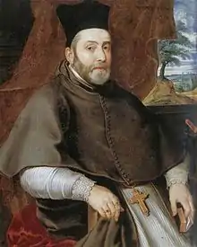 In January 1638 he was appointed bishop of 's-Hertogenbosch. As the city had fallen to the Dutch in 1629, he was not able to enter his see. On 27 October 1641, he was consecrated bishop by Jacobus Boonen, and he exercised his authority as bishop as best he could from Geldrop. On 24 February 1645 he was elected archbishop of Cambrai, taking possession of the see by procuration on 27 July 1646.[2] As Philip IV of Spain had appointed him his representative at the Congress of Münster, he was unable to visit the see in person.[2] He died in Münster on 24 October 1647, before the conclusion of peace, but after having signed a commercial treaty with the Hanseatic League.[2] He was buried in the Augustinian church there.[1] Over a decade later, his family had his remains transferred to the Franciscan convent in Antwerp where they were reburied on 18 September 1663 in a service led by Ambrosius Capello.[2]