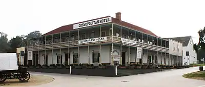 Bandini built a large U-shaped house, Casa de Bandini, in 1829. Initially it had 12 rooms and was one-story. Bandini was forced to sell his house in 1859 due to financial losses. Part of the building was converted into a store. His house was later converted to the Cosmopolitan Hotel in 1869, with a second story and wraparound porch added. The house still stands in Old Town San Diego, at the east corner of the town square, and has recently been fully remodeled and reopened as a hotel and restaurant. Originally the house and hotel were not stuccoed—that was added in modern times to make it look "Spanish Colonial".