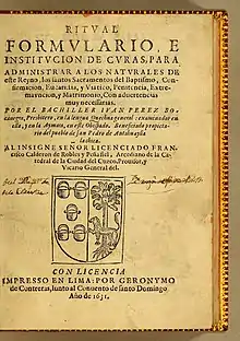 • Juan Pérez Bocanegra. Ritual, formulario, e institución de curas para administrar a los naturales de este reyno, los santos sacramentos del baptismo, confirmacion, eucaristia, y viatico, penitencia, extremauncion, y matrimonio: con aduertencias muy necessarias. Lima: Geronymo de Contreras, 1631. 720 pp. digital facsimile from the John Carter Brown Library collection at the Internet Archive.