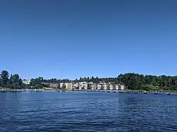 Juanita Beach Park is a 22-acre (8.9 ha) waterfront park located on the northeast shore of Lake Washington in the Juanita neighborhood, managed by the city of Kirkland, Washington in the United States. It was historically the home of several popular private beach resorts before their purchase by the public in 1956. The park straddles thoroughfare Juanita Drive and features a number of amenities, including a pier, a playground, bathhouses, and athletic facilities.[1] It is the busiest waterfront park in Kirkland's recreation system.[2]
