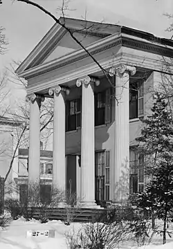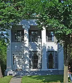 Welles is thought to have constructed the rear addition to the house, and made other extensive alterations.[4] It is likely that the middle section was built in 1835, the temple portion was added in 1843, and the kitchen and servants quarters were added in 1850.[5] In 1855, Welles' son Henry moved into the house with his four daughters (Clarissa, Sarah, Mary Fiske, and Susan Holly),[5] after the death of his wife.[2][5] Henry Welles died in 1860, and the house passed to successive owners.[2] In 1893, the house was sold in a tax sale to George Wahr, and his wife, Emma (Staebler) Wahr.[5] The Wahr family constructed another house next door as their residence, and rented the house to sororities and fraternities.[6] After 20 years, they moved back into the main Wilson-Wahr House.[7] The house passed on to the Wahr's daughter, Natalie Wahr Sallade (who died in 1974),[5] and the Sallades occupied the house until 2002 when it was purchased by Norman and Ilene Tyler.[5]