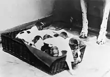 During her stay at the camp, she would alert the prisoners to the approach of the Japanese guards and also if other animals such as snakes or scorpions were around. She also made excursions from the camp, looking for food, and would bring back rats and snakes to Williams.[64] Judy had another group of puppies, of which five survived. One of them was given to the camp Commandant as promised and another puppy was smuggled into the women's camp along with any food that the men could spare.[41][64] A further puppy was given to the Red Cross in Medan, one more was beaten to death by a drunken guard, and the final one remained in the camp after Judy and Williams left.[65]