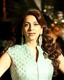 After a period of limited work in films, Chawla made a comeback in 2014 with Gulaab Gang opposite her once-archrival Madhuri Dixit. The film, in which Chawla and Dixit played ruthless political rivals, marked Chawla's role as an antagonist. Her portrayal of Sumitra Devi, a shrewd and conniving politician, was widely appreciated by critics.[80] Shubhra Gupta of The Financial Times described her character as "the sort of politician that men have played for ever: hungry for power, will stop at nothing, not even murder and mayhem. She rules with an iron fist and a sneer."[81] Hindustan Times wrote, "An effective hero needs a larger-than-life villain. In this case, it is Juhi Chawla who marries her sister to a rapist and apparently killed her husband to get political power. Like most corrupt politicians we see onscreen, she is an opportunist who lusts for power. It speaks well about her acting prowess that we come to hate the otherwise effervescent Juhi in this film."[82] Anupama Chopra wrote, "Her perverse wickedness is the best part of the film", but called it a "a one-note character".[83] Rajeev Masand called her "terrific" in the part and concluded a scathing review of the film asserting, "if you must watch this film, watch it for Juhi Chawla's inspired performance."[84] She received a second Filmfare nomination for Best Supporting Actress.[85] The same year she also appeared with Helen Mirren and Om Puri in a guest role in the Steven Spielberg-produced Hollywood film The Hundred Foot Journey.[86]