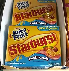Juicy Fruit is an American brand of chewing gum made by the Wrigley Company, a U.S. company that since 2008 has been a subsidiary of the privately held Mars, Incorporated. It was introduced in 1893, and in the 21st century the brand name is recognized by 99 percent of Americans, with total sales in 2002 of 153 million units.[1]