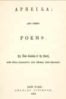 Creswell's cousin, Thomas Bibb Bradley (1829-1855),[8] a poet of promise, who died soon afterward, induced her to publish a selection of her poems with some of his own. The volume appeared in 1854, before her marriage, under the title Apheila, and other Poems, by two Cousins of the South (New York City, 1854).[3][8]