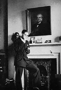 Huxley lights a cigarette under his grandfather's portrait, c.1935.