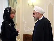 In April 2015, Bishop paid an official visit to Iran, following the conclusion of a visit to India. She was the first Australian government minister to visit the country since 2003, having been personally invited by Iran's foreign minister, Mohammad Javad Zarif. They discussed the proposed nuclear deal and issues relating to Iranian asylum seekers in Australia.[56] Bishop wore a headscarf or a hat for the duration of her visit, and did not shake hands with male dignitaries in order to avoid offending local sensibilities. She received some criticism for doing so, with Andrew Bolt rhetorically asking whether she should have "subjugated herself" to Islamic law. Head coverings are not mandatory for foreign women visiting Iran. In response, she said: "As a matter of fact I wear scarves and hats and headgear quite often as part of my everyday wear".[57][58]