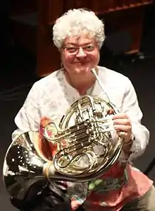 Her students hold prominent positions in orchestras throughout the world.[2] A graduate of Juilliard, her teachers have included James Chambers, Howard Howard and Carmine Caruso. Landsman is featured horn soloist on the recording of Wagner's Ring Cycle with the Metropolitan Opera conducted by James Levine, and has appeared on numerous other recordings. Music festival appearances have included the Marlboro Music Festival, Sarasota Music Festival, Chamber Music Northwest, Santa Fe Chamber Music Festival, Aspen Music Festival and School, Mainly Mozart Orchestra, and La Jolla SummerFest.[3][4][5][6][7] Landsman grew up in Brooklyn.[6]