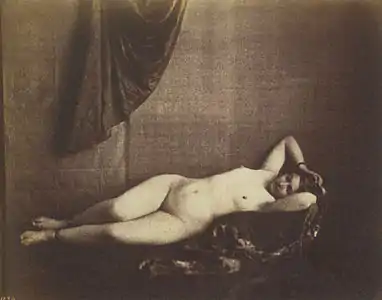 Realist painter Gustave Courbet was introduced to Vallou de Villeneuve's photographs by fellow artist Alfred Bruyas during the 1850s and used them as source material for his paintings,[12] in particular L'Atelier (1855) and Les Baigneuses (1853).[13] In 1954, the 27th Venice Biennale presented a large-scale retrospective devoted to Gustave Courbet;[14] one of the first major exhibitions devoted to the painter. Germain Bazin and Helene Adhémar (conservator, Department of Paintings at the Louvre) were the commissioners of ”A new century of vision[15]" which gave an essential place for artistic creations of the Second Empire. Jean Adhémar, curator, stressed that "first photographers are almost all painters, especially under Napoleon III". The section on “The times of Courbet, Manet, Nadar" was one of the richest in both the number of works presented - forty - and in the range of their subjects: it articulated the parallel between the realistic vision of the painter and the photographer. This was thus the first to attempt to identify the model in the nude photography requested by Courbet of Bruyas and mentioned for the first time by Pierre Borel in 1922.[16] A nude by Jacques Moulin (also exhibited) had previously been connected with the model in The Artist's Studio (L'Atelier du peintre): A Real Allegory of a Seven Year Phase in my Artistic and Moral Life (1855), by evoking the similarity of the models. But two photographs by Vallou Villeneuve, exhibited in the same section, where the model, Henriette Bonnion[17][18] poses in an attitude similar to that in Courbet's 'Bathers' (1853) and 'Artist's Studio' showed it likely (as subsequent studies have confirmed), that the Vallou model and not Moulin's was used by Courbet.[19][20]