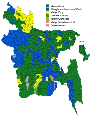 The elections were won by the Bangladesh Awami League, who were just shy of a simple parliamentary majority, winning 146 (of the required 151 for a majority) seats. The election was close in terms of popular vote share between Awami League and BNP, with a difference of less than 4%. However, as a result of first-past-the-post voting, Awami League secured a 30-seat lead above BNP. The election saw a high voter turnout of ~74%.[7]