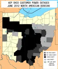 Damage was widespread and extensive along the entire path of the derecho, especially in northern Indiana and the Fort Wayne metro area, central and western Ohio, northeastern Kentucky, southwestern Pennsylvania, West Virginia, northern, central, and southwestern Virginia,[15] Maryland, Washington, D.C., Delaware and southern New Jersey. In all the mentioned areas, many trees uprooted or snapped, roofs became damaged, tents deployed to sell fireworks leading up to the 4th of July Holiday collapsed, and power outages were extensive, with over 4.2 million customers losing power as a result.[16] [17] An Appalachian Power representative described the power outage as the worst the company had ever seen.[15] In total, 22 people were killed across seven states and the District of Columbia.[18] At least ten of those deaths were in Virginia, all of them due to fallen trees.[15] Two of the deaths were in New Jersey, after two children were killed by falling trees at a campground at Parvin State Park, three deaths were reported in Maryland and one death was reported in Ohio after the storm.[19] As it occurred in the midst of the record Summer 2012 North American heat wave, conditions on following days were problematic, particularly for seniors and vulnerable people. Scattered structural damage also occurred along the path of the derecho, from both falling trees and the winds themselves. Some of the damage included siding was torn off houses, roofs removed from houses, businesses and apartment buildings, mobile homes heavily damaged, barns and garages destroyed and airplanes flipped.[7]
