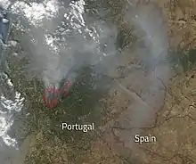 An intense heat wave preceded the fires, with many areas of Portugal seeing temperatures in excess of 40 °C (104 °F).[6] During the afternoon of 17 June, a total of 156 fires erupted across the country, particularly in mountainous areas 200 km (120 mi) north-northeast of Lisbon.[7][8] The fires began in the Pedrógão Grande municipality before spreading dramatically causing a firestorm.[9]
