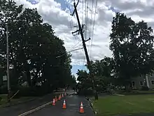 The storm also caused massive power outages in southeastern Pennsylvania and New Jersey. More than 850,000 individuals lost electricity on June 3,[30] including 200,000 in New Jersey.[31] Several long-term care facilities in Montgomery County, Pennsylvania lost electricity and utilized emergency generators to protect the residents.[27] The following day, around 100,000 homes and businesses in New Jersey remained without power. Most of the outages were located in Burlington and Camden County, New Jersey.[31] In Pennsylvania, over 56,000 individuals remained without power on June 5.[32] Although the number dwindled to 16,500 on Sunday, June 6, PECO Energy received several complaints from those individuals about their lack of electricity during a period of high temperatures, as well as the company's delayed time frames for when their electricity might be restored.[30] PECO Energy recruited service crews from states including Oklahoma, Illinois, Florida, and New Hampshire to undertake repairs and restorations.[32] PECO, who had been using drone technology for several months prior to the storm but had been seeking opportunities to incorporate the technology into storm restoration, used their drones to assess damage aerially at speeds that would have been much slower from the ground. All power was restored by June 9.[33]