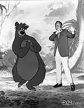 For The Jungle Book, Disney wanted to bring in more well-known performers to voice the key characters, which was a rarity in his past works.[45] All the celebrities cast in the film had inspired the animators in creating the characters[52] and helped them shape their personalities.[58] The studio held many auditions for the role of Baloo,[6] initially searching for an Ed Wynn-esque voice; the animators also tried out exchange students from India to see if they could get a voice with an indigenous quality, but the idea did not work out.[59] Disney eventually suggested Phil Harris[29] after meeting him at a benefit in Palm Springs,[52] much to the surprise of the animation staff,[59] who could not imagine a wise-cracking comedian such as Harris as Kipling's character.[45] Harris nearly turned down the role after doing a test recording,[6] because he could not see himself as the character,[60] but reconsidered after the filmmakers allowed him to perform the way that felt the most comfortable to him.[33] Wolfgang Reitherman said when they "told him not to be a bear, but to be Phil Harris, he got in front of the microphone and tore that thing apart".[6] Most of Baloo's lines were improvised by Harris.[45]