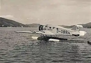 Both ships had been fitted with compressed air-driven catapults for this purpose. These catapults accelerated the 3,200 kg (7,050 lb) aircraft to a speed of 110 km/h (70 mph) at a distance of just 20 m (65 ft). The launch of these aircraft, painted bright red for easy spotting by rescue planes in case of emergency landings at sea, was always a special experience for the passengers. The launch at a distance of about 1,200 km (750 mi) from the destination allowed to land the mail some 24 hours ahead of the mother ship's docking.[4] On Westbound crossings, they flew to New York; Eastbound to Southampton, where they refuelled and went on to Bremen. These activities were limited by weather to the summer months, beginning in April 1932.