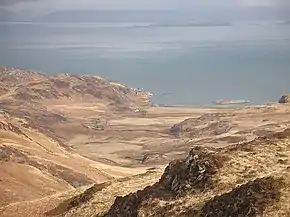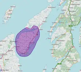 Between Jura's northern tip and the island of Scarba lies the Gulf of Corryvreckan, where a whirlpool makes passage dangerous at certain states of the tide. The southern part of the island, from Loch Tarbert southwards, is designated a national scenic area (NSA),[11] one of 40 such areas in Scotland.[12] The Jura NSA covers 30,317 hectares (117 sq mi): 21,072 of land and 9,245 of adjacent sea.[13]