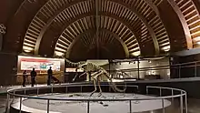 MUJA's main collection centres around 8,000 fossils from Asturias' Jurassic period. Divided into four sections, one contains 150 traces from the coast; another has 200 fossils of dinosaurs, crocodiles, fish, and tortoises; the third has 103 vegetable fossils and eleven tree trunk fragments; and the last has approximately 6,000 invertebrate fossils. A module explains the geological history of Asturias, focusing on the Jurassic Coast and the marine levels that formed the city of Gijón. Some of the replicas include a couple of copulating Tyrannosaurus rex, as well as an Argentine Giganotosaurus, one of the largest known carnivorous dinosaurs. A large-clawed Deinonychus is also featured.[6] Quintueles, Oles, and Tazones specimens are housed at the MUJA.[11]