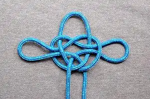 The jury mast knot (or masthead knot) is traditionally presented as to be used for jury rigging a temporary mast on a sailboat or ship after the original one has been lost; some authors claim a use for derrick poles --but there is no good evidence for actual use. The knot is placed at the top of a new mast with the mast projecting through the center of the knot. The loops of the knot are then used as anchor points for makeshift stays and shrouds. Usually small blocks of wood are affixed to, or a groove cut in, the new mast to prevent the knot from sliding downwards.[1]
