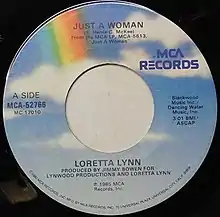 The song was released as a single in January 1986 via MCA Records.[3] It spent a total of five weeks on the Billboard Hot Country Singles chart before reaching number 81 in February 1986.[4] It was the title track of Lynn's 1985 studio album. It was among her final album releases for MCA Records.[2] "Just a Woman" was the final single spawned from her album of the same name. It was also Lynn's lowest-peaking single on the Billboard country chart.[3]