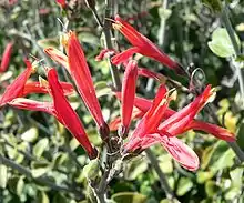 It can grow to 1.5 metres (5 feet) in height and almost as wide.[1] For a short time it bears succulent leaves about 1.5 centimetres (58 inch) in width.[1] It loses its leaves and then produces plentiful tubular flowers about 2.5–4 cm (1–1+58 in) long between February and June.[1] These are usually in shades of bright to deep red, or sometimes yellow, with a two-lobed upper lip and a wide three-lobed lower lip[1] that falls open to reveal the inside of the blossom.