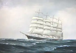 Five-masted barque "København" with ØK in her sail. Oil-painting by Peder Chr. Pedersen.
