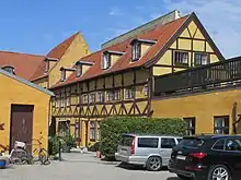 The gable of the side wing is attached to a somewhat lower 13 bays long two-storey building with exposed timber framing.[2]