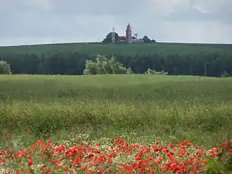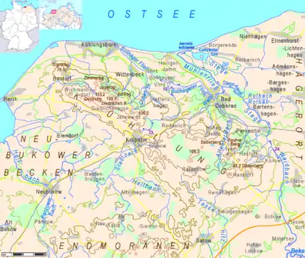 The ridge extends from northwest to southeast for about 23 kilometres and is between three and eight kilometres wide. The northwestern part is a ridge, eleven kilometres long, called the Driedrichshagener Berge ("Driedrichshagen Hills"), or – colloquially – simply "Kühlung". The Driedrichshagener Berge begin near the sea with the hill known as the Bastorfer Signalberg (height 78.8 metres), on which stands the landmark of the Bastorf Lighthouse. The northern slope of this ridge with its short valleys and deep, natural pits (Ger.: "Kuhlen") gave its name to the whole landscape. This slope is covered by a contiguous strip of forest, between 500 metres and one kilometre wide, with a total area of 6,300 hectares. Another important forest on the Kühlung is the Hütter Wohld in the east. In its longest valley there is a series of ponds, the Hüttener Klosterteiche, that are under a higher level of protection than the rest of the Kühlung. The Hütter Wohld is situated on the eastern edge of the eastern Kühlung, called Ivendorfer Höhen ("Ivendorf Heights"). This little upland is almost as broad as it is long. On its heights there are forests on the soil of former mosses. A little over half the Kühlung is used for fields and pasture.[1]