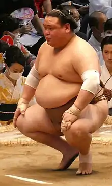Beginning his career at just 15, he was considerably younger than most of his training partners at his stable.[1] He weighed just 103 kg and was 177 cm tall when he made his professional debut in September 2009.[2] After his first tournament he was given the shikona of Kōtokuzan ("Kōto" being a different reading of the "Ara" or 荒 kanji used at his stable and not related to the "Koto" commonly used at Sadogatake stable). He won no championships moving up through the professional sumo divisions and moved between the fourth-tier sandanme and third makushita divisions a number of times before finally establishing himself in makushita in 2017.[2] By this time his weight had increased to 156 kg.[1] He was forced to sit out the January 2021 tournament due to a COVID-19 outbreak at his stable, but in the following tournament a 4–3 record moved him up to Makushita 1. In May 2021 he earned promotion to the sekitori ranks with a 5–2 record.[2][3] Although his jūryō division debut in July was unsuccessful, a 4–11 score dropping him back to makushita, he returned to jūryō in November and two consecutive winning records in double figures saw him promoted to the top makuuchi division for the March 2022 tournament.[2] He followed his stablemate Wakamotoharu, who had made his top division debut in the previous tournament. Kōtokuzan represents Kanagawa Prefecture, and he is the tenth wrestler from that prefecture to reach makuuchi.[4]
