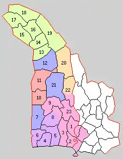 Map of Kōza District with Meiji period area in yellow, modern area in green