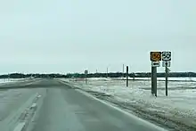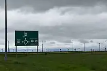The route has changed little, but in August 2001, work began on a $17.5 million (equivalent to $27.8 million in 2022[13]) project to reconstruct the entire length of K-150. New bridges were built, asphalt shoulders were added and the sight distances were improved. Work was completed by August 2003.[14] In 2012, KDOT decided that the western terminus was to be rebuilt as an enhanced roundabout.[15] Construction on the $5.416 million (equivalent to $6.57 million in 2022[13]) enhanced roundabout at the western terminus began in June 2015. The roundabout was enhanced by leaving in place the shooflies that were installed to take traffic around the site during construction. This allows oversized trucks that wouldn't fit on the roundabout to pass.[16][17] K-150 was closed from early September 2015, to late December 2015, and traffic was detoured south along US-77 to make room for construction on that section of the roundabout. The roundabout was completed and open to traffic in December 2015.[18]