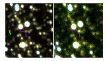 Couple of images showing the difference in luminosity of a star during the passage of the microlensing created by the exoplanet.