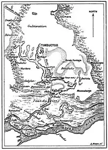 In the past, the area flooded by the Niger was more extensive than today. In years with high rainfall the floodwater would reach the western outskirts of Timbuktu itself.[1] The Koriomé canal from Daï to Kabara was dug by the emperor Soni Ali Ber when he captured Timbuktu in 1468. An extension known as the "Hippopotamus Canal" was later excavated from Kabara up to Timbuktu.[2] A small navigable waterway to the west of Timbuktu is shown on the maps published by Heinrich Barth in 1857 and Félix Dubois in 1896.[3][4]