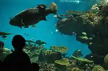 The Kagoshima Aquarium has a large Kuroshio tank with a water volume of 1,500,000 litres (396,000 US gal), but it is not large enough to captivity whale sharks that easily exceed 10 m (33 ft) when grown.[9] Therefore, the Kagoshima Aquarium is exhibited and captivity by the "Kagoshima method", in which training is conducted to return to the wild before the body length reaches 5.8 m (19 ft), and then returned to the wild. A transmitter is attached to the whale shark that returns to the sea, and it has been successful in grasping the migration route of the whale shark.[10]。