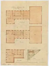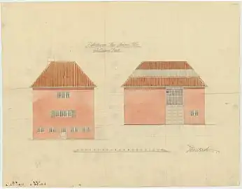 The house is an example of the style known as Bedre Byggeskik. Ivar Bentsen was one of the leading figures of the Bedre Byggeskik movement. The style combined inspiration from traditional Danish architecture with inspiration from the Arts and Crafts movement and an emphasized the use of high quality building materials and craftmanship. The combination of yellow brick walls, white-painted windows with shutters and a red tile roof is characteristic of the style. The house is a three-winged building. One of the two side wings contain Nielsen's atelier with double high ceilings, ultramarine blue walls and a window band that runs just below the ceiling. The wall colour is similar to that of the vestibule in Faaborg Museum. Nielsen had designed a large statue of Mads Rasmussen for the room. The wall colour of the atelier had been changed and the ceilings had been lowered but the architectural firm Bertelsen & Scheving Arkitekter completed a restoration of the atelier in 2020.[4]