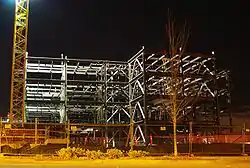On June 17, 2009, construction began with a groundbreaking ceremony attended by local dignitaries including Hillsboro mayor Jerry Willey and Oregon Governor Ted Kulongoski.[18] After excavation during the summer, construction of the steel-and-concrete frame began in 2010.[19][20] As of August 2010, completion was scheduled for spring 2012, with construction costs totaling $220 million out of a total cost of $360 million.[20][21] Kaiser announced in April 2012 that construction would end in summer 2012 and the hospital would open in August 2013 at a cost of $344 million.[22] The facility held open houses in May 2013 and set the opening date as August 6, 2013.[23] In May 2013, the hospital was certified as a Leadership in Energy and Environmental Design Gold building.[24] The hospital opened on the scheduled opening day.