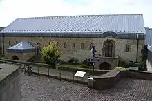 The term Kaiserpfalz (German: [ˈkaɪzɐˌpfalts], "imperial palace") or Königspfalz (German: [ˈkøːnɪçsˌpfalts], "royal palace", from Middle High German phal[en]ze to Old High German phalanza from Middle Latin palatia [plural] to Latin palatium "palace"[1]) refers to a number of castles and palaces across the Holy Roman Empire that served as temporary, secondary seats of power for the Holy Roman Emperor in the Early and High Middle Ages. The term was also used more rarely for a bishop who, as a territorial lord (Landesherr), had to provide the king and his entourage with board and lodging, a duty referred to as Gastungspflicht.