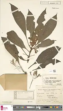 The genus Kajewskiella was established by Elmer Drew Merrill and Lily May Perry in 1947.[1] Its position within the Rubiaceae is somewhat uncertain. The original describers were unable to suggest a definite placement.[3] It has been placed in the tribe Dialypetalantheae (=Condamineeae), and also considered to be related to the genus Xanthophytum, which is placed in the tribe Ophiorrhizeae. The relationship with Xanthophytum is supported by morphological data but molecular data was not available in a 2019 study.[4]