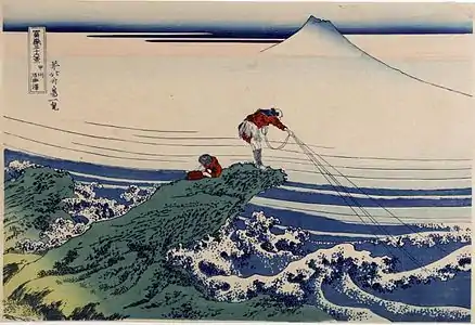 Standing precariously upon a rocky outcrop, a man casts his net onto the violent Fuji River at Kajikazawa.[2] Man and nature appear fused into one: The picture is full of movement, his tensed body mimics the motion of the waves below, and this curved shape is reflected in the rock on which he stands. The triangular shape made by the fishing lines also echoes that of Mount Fuji which is seen rising above.[1]