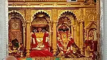 The complex is divided into two parts, the ground floor containing Hindu shrines, while the temple spire is domed with a Muslim shrine.[10] The chief shrine on the ground floor contains three divine images: in the centre Kalika Mata in the centre (depicted in the form of a head, known as mukhwato and red in colour[3]), while Bhadrakali is situated to her right and Bahuchara Mata to her left. The restored marble floor dates to about 1859 and was presented by the minister of Limbdi in Kathiawar. The domed temple spire contains a Muslim shrine and mausoleum to Sadan Shah Pir, a Sufi saint.[10]