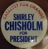 A Shirley Chisholm button, whose typography Harris paid tribute to in her campaign
