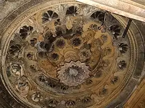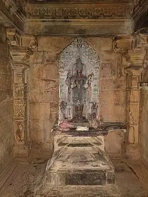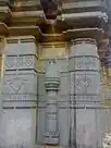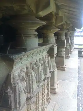 It contains sculptures, including lions and floral motifs. The temple has three cells and hence comes under the classification of Trikutachal temples.[2] There are three shrines here. The first shrine has a statue of Narayana. The second has a statue of Lakshmi Narayana, with the Goddess Lakshmi seated on the lap. The third shrine has a statue of queen Kamala Devi, with her attendants on either sides.[4] The interior roof of the temple has an exquisitely carved gigantic lotus in an inverted form. The temple roof stands on colonnade of pillars with rich carvings. Pillars with roaring lions between them pyramidal towers surrounding these pillars and having girls in poses between them and beautiful scroll work on top. The stone panels along the facade of the temple have emblems of the Kadamba dynasty and other figures.[2]