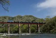 A limestone freight train crossing the Oyahana Viaduct over the Arakawa River near Kami-Nagatoro Station in April 2011