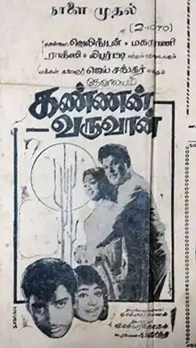 Kannan Varuvan (transl.Kannan will come)[1] is a 1970 Indian Tamil-language film directed by I. N. Murthy and written by A. L. Narayanan from a story by A. Gurusami.[2][3] The film stars Jaishankar, Muthuraman, Lakshmi, Nirmala and Vijaya Lalitha. It was released on 2 October 1970.
