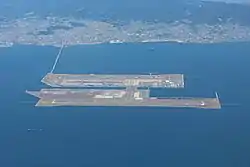 Satellite photo of Kansai Airport (lower-right island) in Osaka Bay. Kobe Airport is being built on the unfinished island near the middle of the photo. Central Osaka is in the upper-right corner, along with Osaka International.