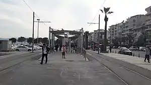 Karşıyaka İskele is a light-rail station on the Karşıyaka Tram line of the Tram İzmir system in İzmir, Turkey. It is located on Hergele Square, alongside Cemal Gürsel Avenue, next to the Karşıyaka ferry terminal and across from the southeastern end of the Karşıyaka Çarşı. East of Karşıyaka İskele, the line becomes single-track until Alaybey. The station consists of a single entrance/exit on the eastern side toward the ferry terminal.