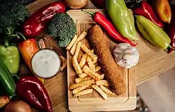 Karađorđe's schnitzel (Serbian: Карађорђева шницла/Karađorđeva šnicla) is a Serbian breaded cutlet dish named after the Serbian revolutionary Karađorđe. It is a rolled veal or pork steak, stuffed with kajmak, and then breaded and fried. It is served with roasted potatoes and tartar sauce.